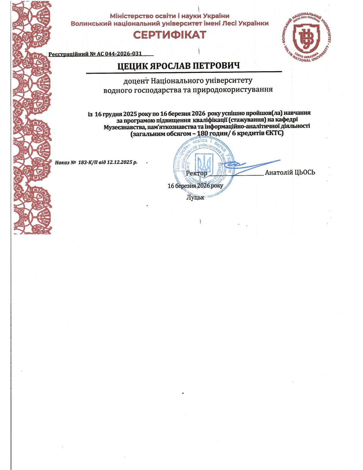 Цецик Я.П. із 16 грудня 2025 року по 16 березня 2026 року успішно пройшов навчаня за програмою ПК на кафедрі Музеєзнавства, пам'яткознавства та інформаційно-аналітичної діяльності загальним обсягом - 180 год/ 6 кредитів ЄКТС