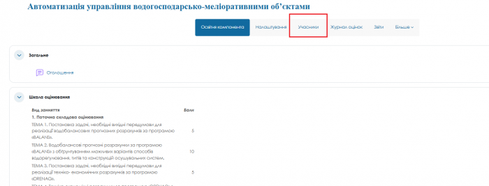 На курси потрібно зарахувати Викладачів, які будуть наповнювати ОК контентом та відповідати за проведення навчального процесу та оцінювання на ОК. Для цього натискаємо “Учасники” на панелі інструментів на сторінці курсу (Рис. 2.10) | |||