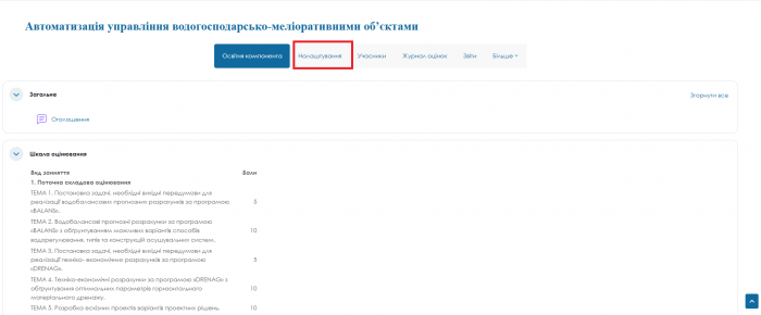 Перейшовши на курс Ви опинитесь на сторінці ОК (вкладка "Освітня компонента"). Щоб змінити дати проведення курсу на панелі інструментів потрібно перейти на вкладку “Налаштування” (Рис. 2.5). | Перейшовши на курс Ви опинитесь на сторінці ОК (вкладка "Освітня компонента"). Щоб змінити дати проведення курсу на панелі інструментів потрібно перейти на вкладку “Налаштування” (Рис. 2.5). | ||