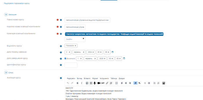 Далі змінюємо дати початку та завершення курсу згідно з навчальним планом у полях на Рис. 2.6. | Далі змінюємо дати початку та завершення курсу згідно з навчальним планом у полях на Рис. 2.6. | ||