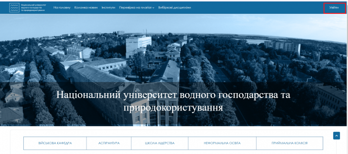 Для входу на навчальну платформу Moodle натискаємо кнопку “Увійти” в правому кутку верхньої панелі, як показано на Рис. 1.1. | Для входу на навчальну платформу Moodle натискаємо кнопку “Увійти” в правому кутку верхньої панелі, як показано на Рис. 1.1. | ||