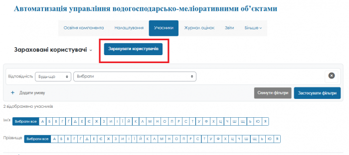 [[Файл: | [[Файл:Рис. 2.11. Розміщення кнопок “Зарахувати користувачів”.png|700px|міні|центр|Рис. 2.11. Розміщення кнопок “Зарахувати користувачів”]] | ||
