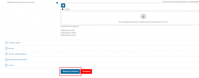 [[Файл: | [[Файл:Рис. 2.5. Розташування вкладки “Налаштування” на курсі.png|700px|міні|центр|Рис. 2.5. Розташування вкладки “Налаштування” на курсі]] | ||