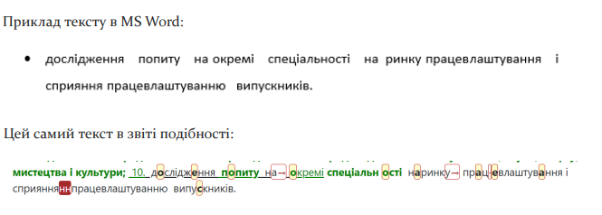 Інтервали між літерами можуть створювати візуальні пробіли або злиття слів. Система шукає точні комбінації слів, тому зміни у форматуванні (додаткові пробіли або розриви слів) можуть знизити відсоток подібності, навіть якщо зміст тексту не змінено.